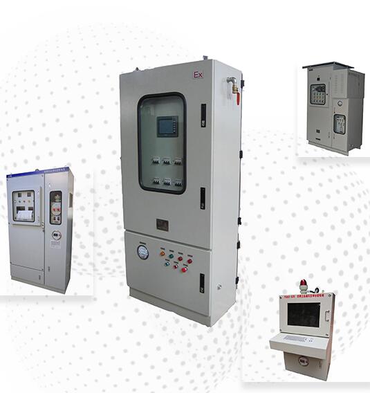 采用介質(zhì)隔離點燃源的防爆措施。即:把用戶所用的電器元件安裝在一個充滿正壓潔凈氣體的柜體內(nèi),使外部環(huán)境中易燃易爆的混合性氣體無法接觸到電器元件在正常工作時所產(chǎn)生的電火花或危險溫度,從而達到電器防爆的目的。